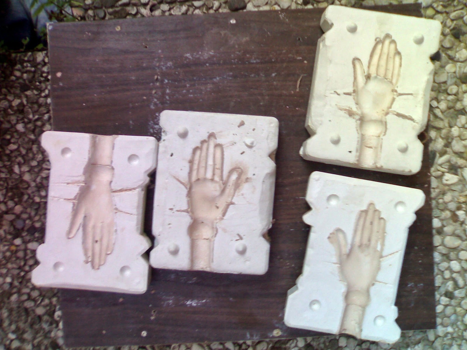 Bambola snodabile da collezione Eva Vodoo: I pezzi crudi, prima rielaborati (larghezze aggiustate ritoccati e carteggiati), crudi appena usciti dai calchi. Poi i calchi aperti vuoti e uno chiuso con una colata di creta dentro: